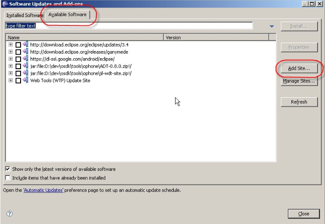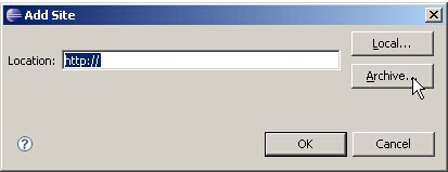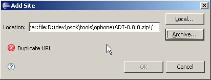 (4)找到OPhone SDK安装目录下tools\ophone\ ADT-0.8.0.zip(因为我已经安 装好了ADT,所以出现了重复URL的提示),点击OK即可开始安装
