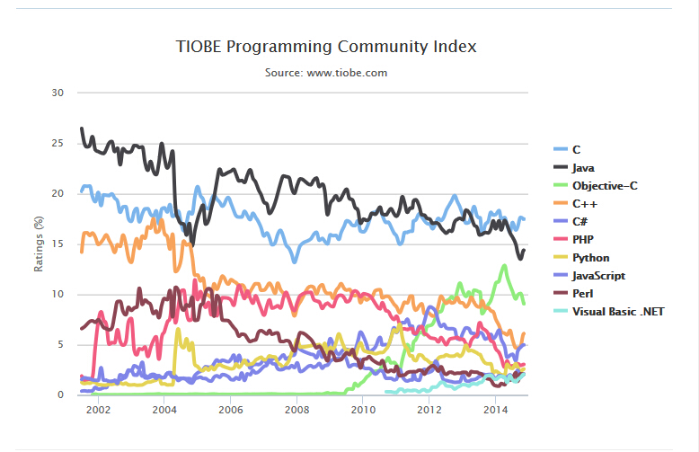 2014年11月编程语言排行榜昨天发布,前三名仍然没有变化,C、Java、Objective-C。但因为大数据的炒作,本月R跃升至12位,上个月排名15。
