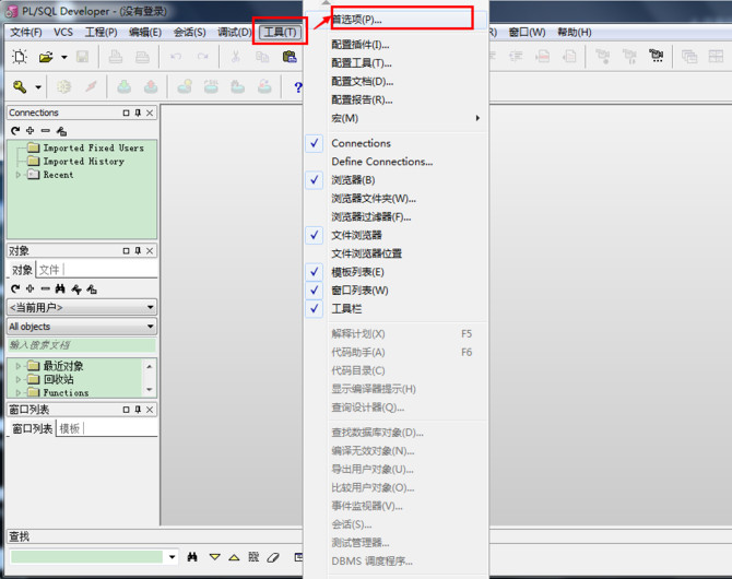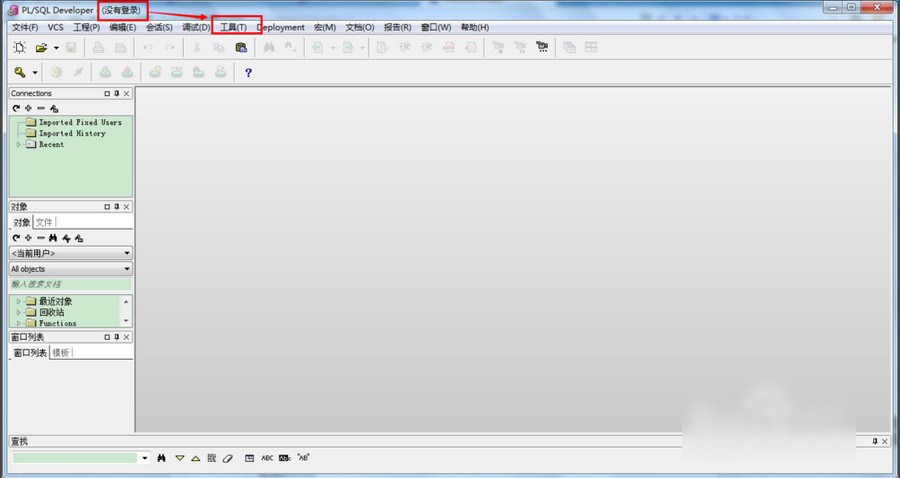 2、首先打开PLSQL界面弹出登录框这个时候您很冲动的输入了正确的用户名密码,以及ip地址端口号,但是您点击确定时弹出如下第一张图所示这说明您本机没有安装Oracle客户端或者PLSQL工具首选项中没有配置正确.因此直接点取消,PLSQL会自动打开软件如下第二图.您会看到软件的左上方提示没有登录