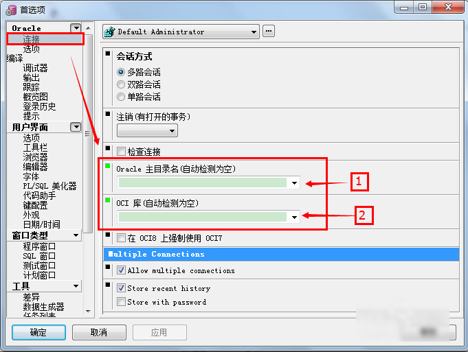 3、按照下图的第一图指引,点击工具→首选项弹出如下第二图,根据红色框中的位置您会发现中间有个Oracle主目录,其中第①个是Oracle主目录,第②个是Oracle参数配置信息目录(需要一个配置文件路劲),这时您需要下载一个配置文件,配置文件地址我会赋在文档的末尾
