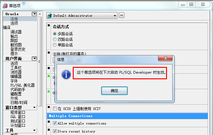 4、文件路劲地址复制进去后,会立即弹出提示您更改将在重启PLSQL后有效,如下图所示点击确定,然后关闭PLSQL程序,重新打开PLSQL