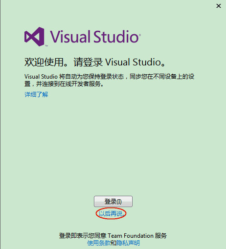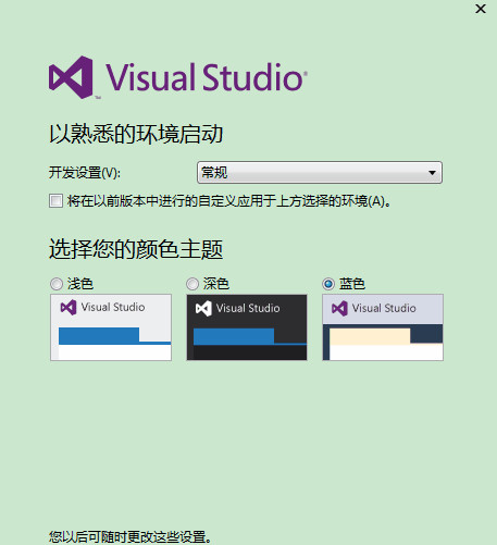 6、第一次打开可能需要进行一些基本配置,如开发设置、颜色主题,根据自己的需求设置,然后等待几分钟就可以使用。由于VS2013引入了一种联网 IDE 体验,大家可以使用微软的账户登录,而且其还自动采用联网 IDE 体验的设备上同步设置,包括快捷键、Visual Studio 外观(主题、字体等)各种类别同步的设置
