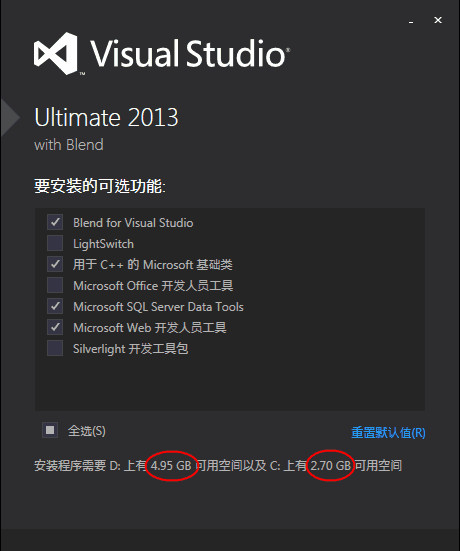 4、在选择安装的可选功能这里,大家可以根据自己需要勾选,也可以默认全选。这里有个小功能,把鼠标放在文字上,会弹出各个功能的详细描述。小编选择四个常用的功能,另外要注意预留空间,开始安装。