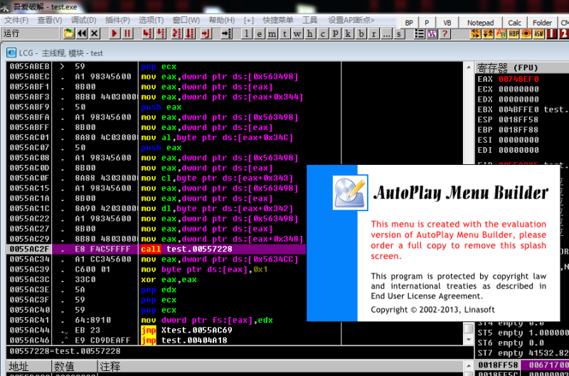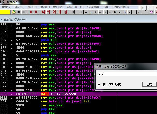 3秒之后界面消失,语句执行到下一行了,上面这个call test.00557228就是要找的,call后面是什么每个人都不一样,但就是这个call调出了这个闪屏界面。双击它,在弹出的对话框中写入nop,点击汇编,再关掉该对话框即可。