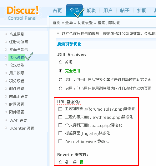 Rewrite 规则配置成功了,但是这个时候浏览论坛地址依旧不是伪静态的,还需要到论坛后台做相应的设置才可以。论坛后台 => 全局 => 优化设置,下图中红色区域选项: