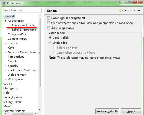 步骤一:打开eclipse,找到“window”--“preferences”,在左边的菜单栏中找到general,appearance在general展开后的第一行,点击展开appearance;