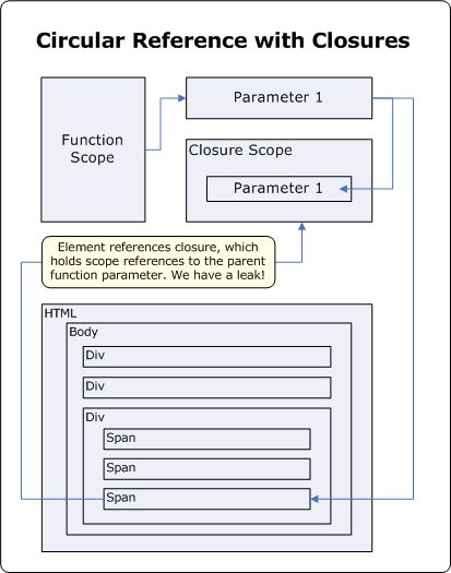 闭包的一个内部方法赋给了element对象,产生了一个作用域的循环引用,从而造成内存泄露.其原理图如下: