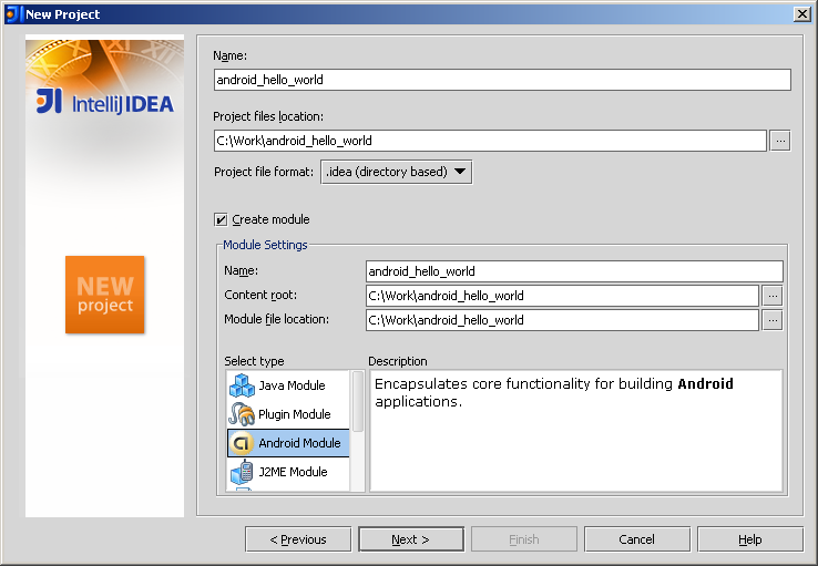 在接下来的页面指定Project的名字,然后Create module,在选择框中选择Android Module作为项目的类型,然后给项目命名为android_hello_world