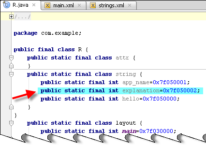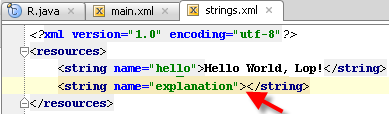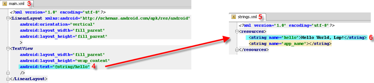 现在,让我们打开main.xml(3)文件,这里IntelliJ已经帮助我们列出了hello在res/values/strings.xml文件中的对应。