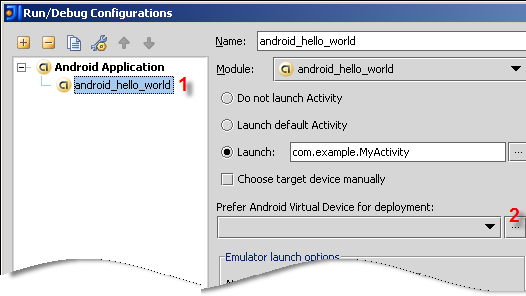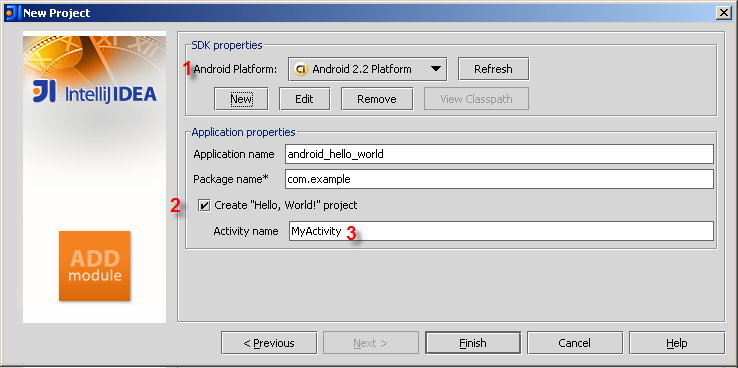 你选择OK之后,接下来就是要选择Android Platform,(1)是选择列表,要是简单的应用就选择(2)Create "Hello,World!" project选择框,这是接受默认的activity为MyActivity(3)