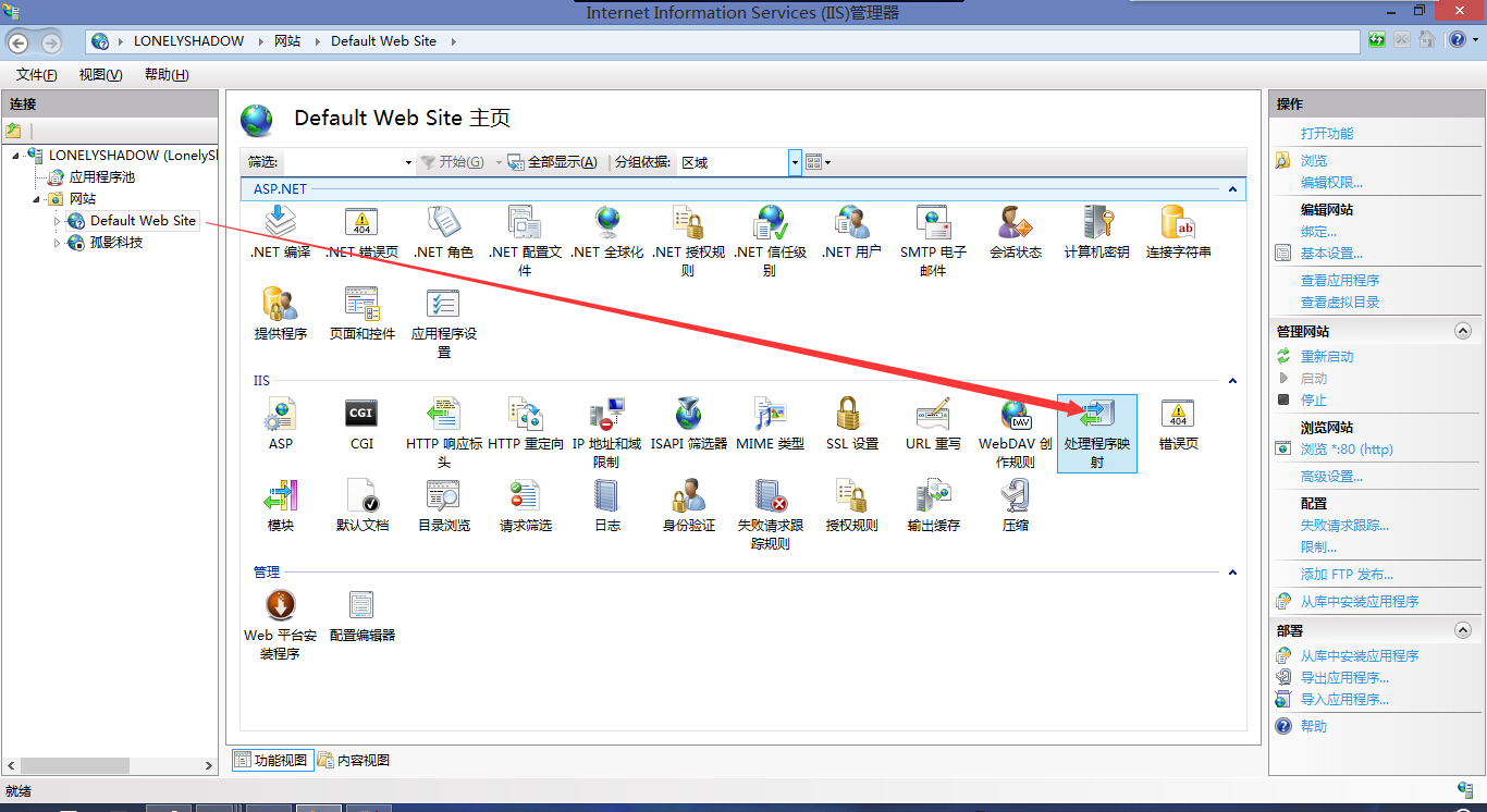 回到IIS管理中心,点击目标网站,在右侧找到“处理程序映射”: