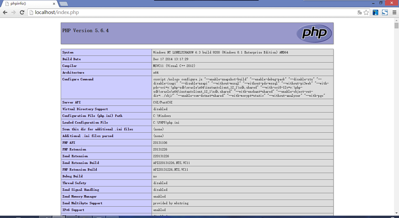 然后,访问“http://localhost/index.php”,便可以看到PHP的信息页面: