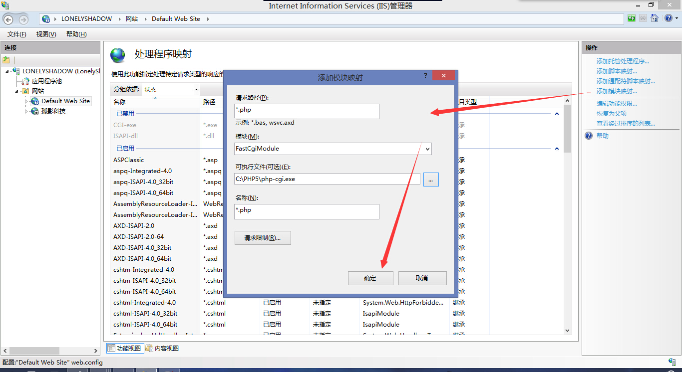 打开“处理程序映射”,点击右侧的“添加模块映射”,弹出模块映射设置窗口,名称输入“*.php”,模块选择“FastCgiModule”,执行程序选择你刚刚下载配置的PHP目录中的“php-cgi.exe”,最后确定: