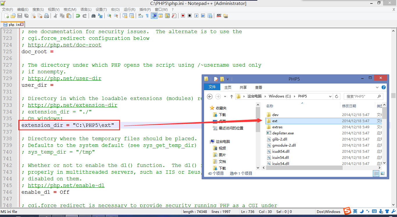 然后搜索“extension_dir”,去掉前面的分号,并且指定PHP环境扩展文件所在目录,也就是下载PHP中的ext文件夹,例如我的: