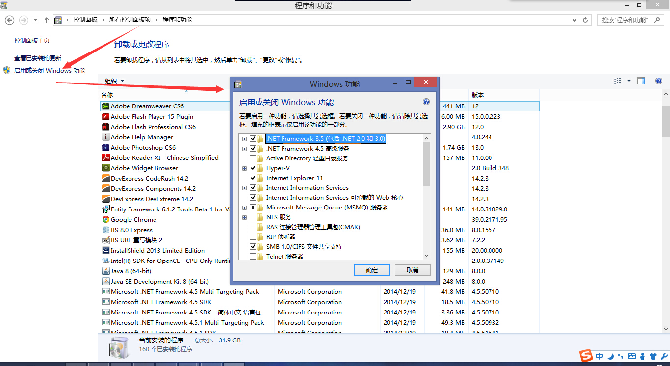 打开卸载程序面板,点击左侧的“打开或关闭Windows功能”,然后打开了“Windows功能”窗口: