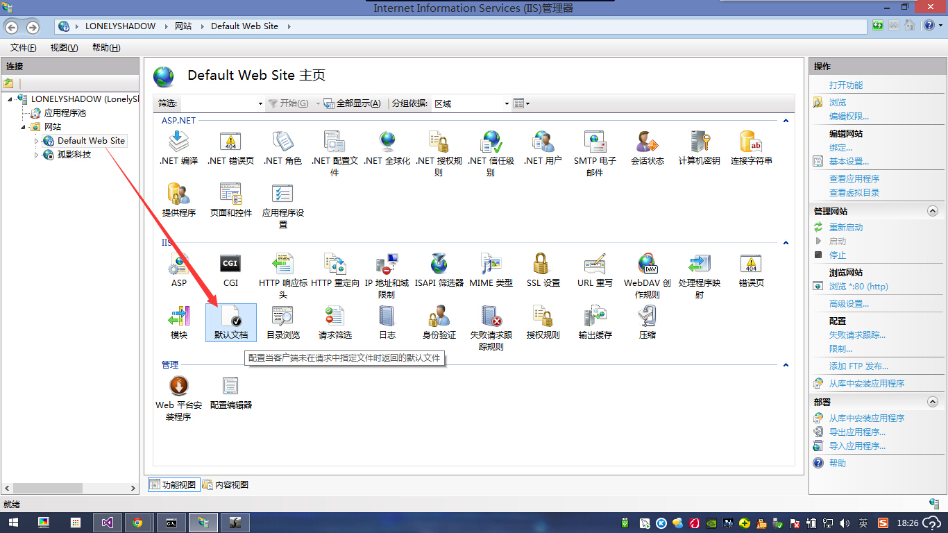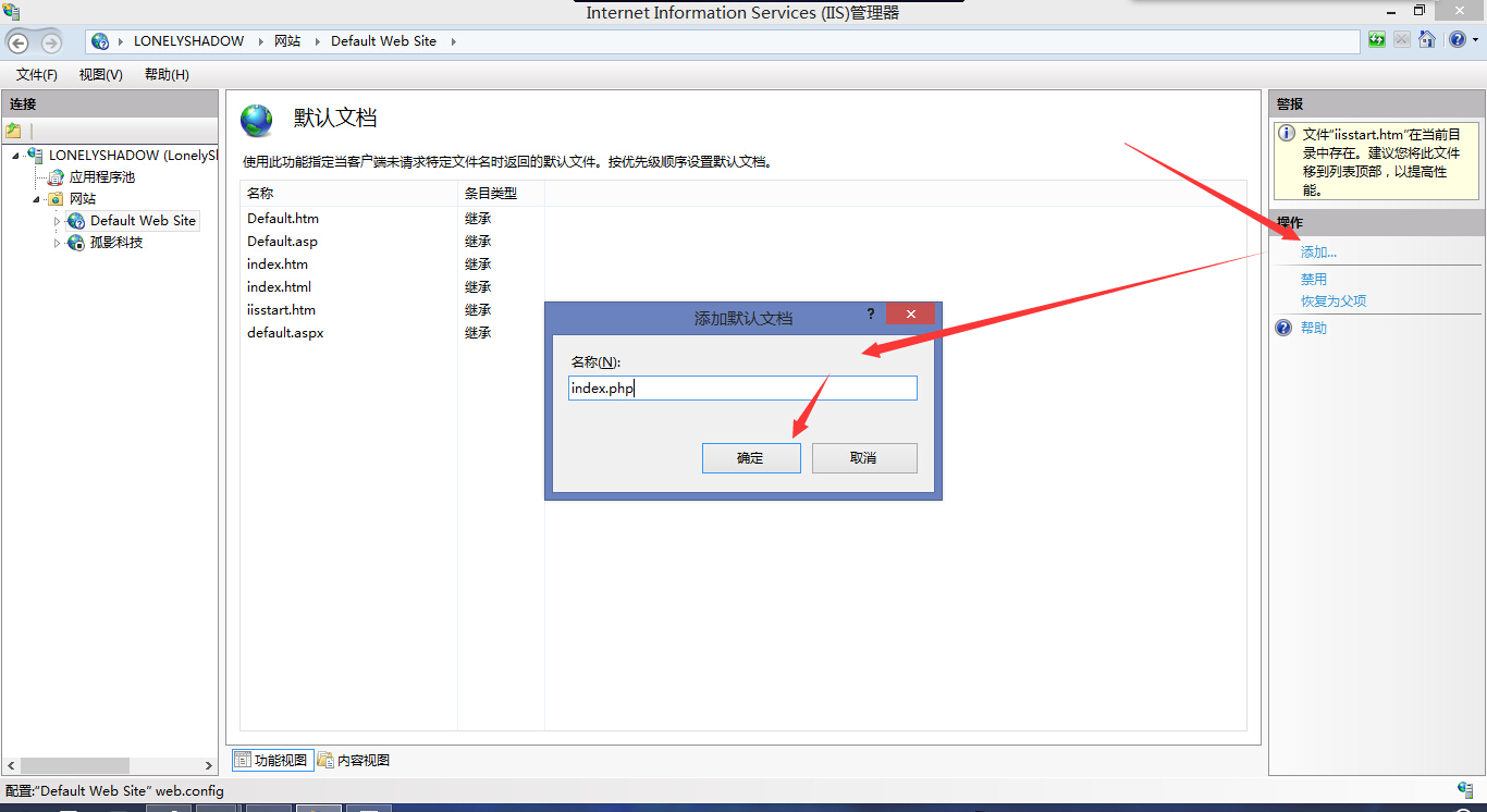 然后,点击网站,右侧的“默认文档”中,添加php的默认页面“index.php”项: