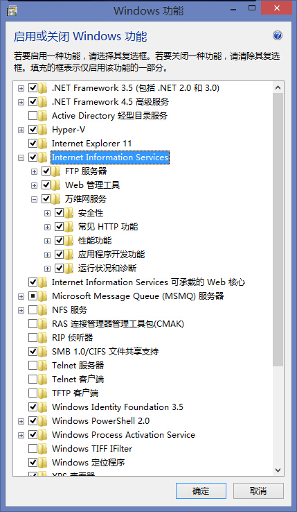 貌似除了Windows Server的系统,其他的系统里面IIS都是默认关闭的,需要手动开启。