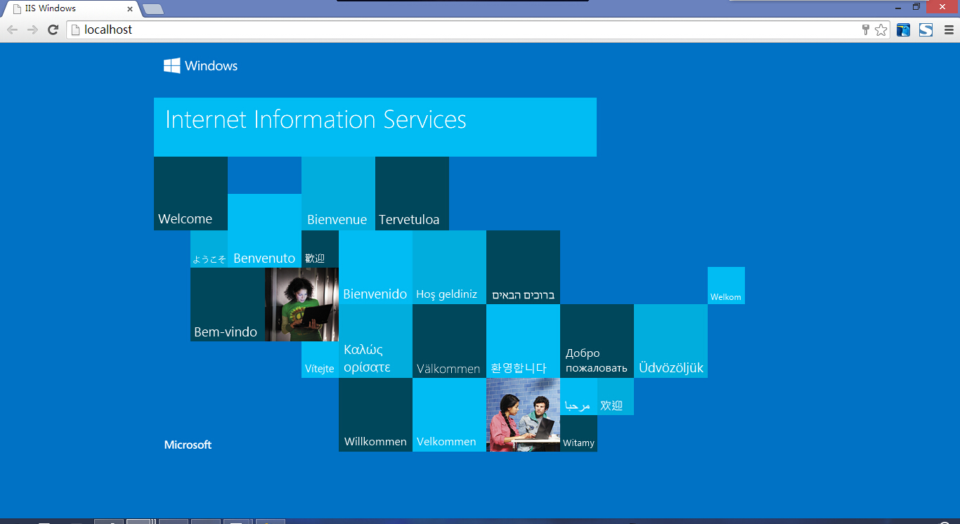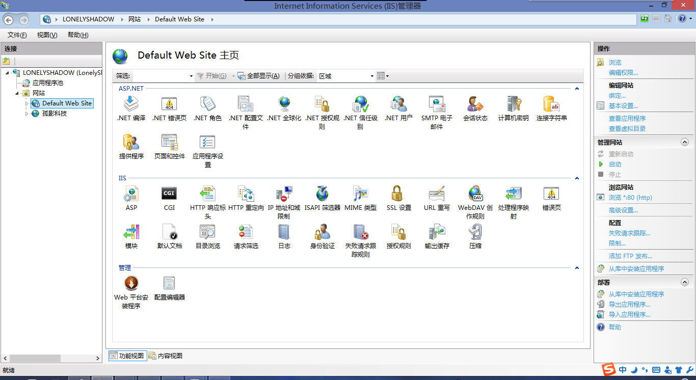 左侧网站中会有一个默认站点“Default Web Site”,默认自动启动的,我们访问"http://localhost",会显示IIS 8的欢迎界面,表示IIS启用成功: