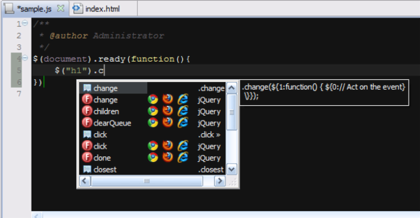 c.打开“sample.js”,会发现aptana已经能够进行非常漂亮舒服的提示~\(≧▽≦)/~啦啦啦