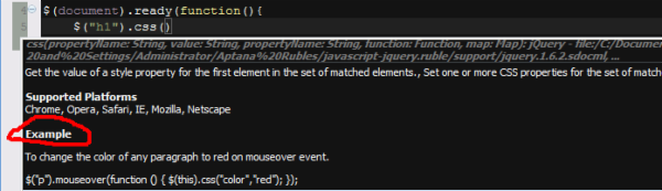 d.另外,说下,如果你对哪一个方法或事件不熟悉,不知道怎么用,aptana会给出例子,你可以参考的。