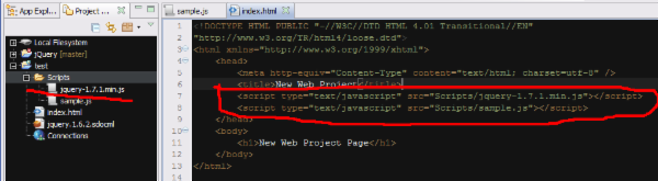 e.最后如果要用到js文件,别忘了在html文件中引入jquery原本的库文件,如“jquery-1.7.1.min.js”