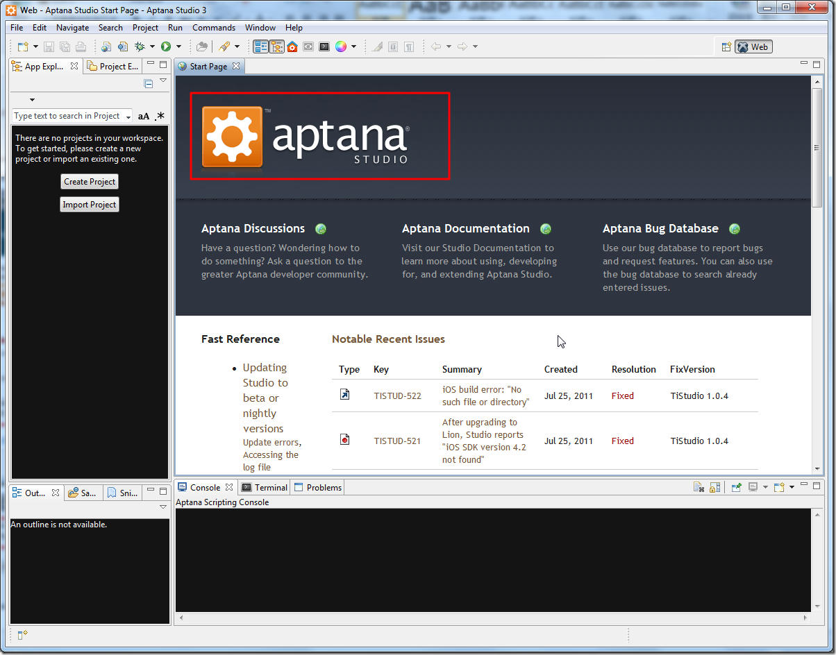 (1)首次打开aptana studio的画面基本如下图所示(图中我已建了一个项目):