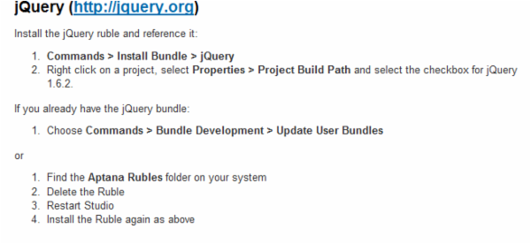 后来就去下载了aptana studio 3,但是在添加其对jquery的支持的过程中,仍然遇到一些问题,可见每一个新手开总是很难的,遂记录下来供以后的新手参考,让他们能够少走些弯路吧。