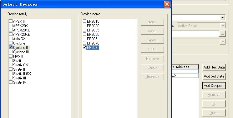 6.Input files to convert对话栏内,选中Flash Loader,点击Add Device按钮,在弹出对话框中选择你的FPGA芯片,如EP2C35;