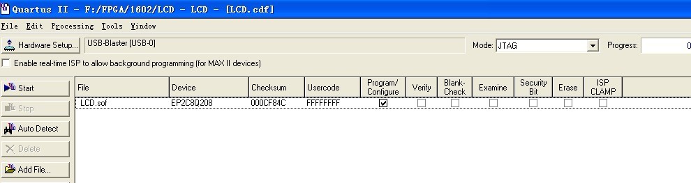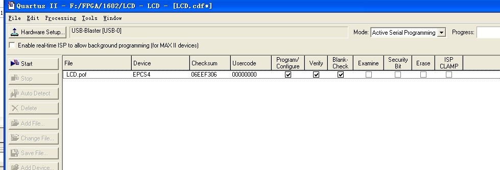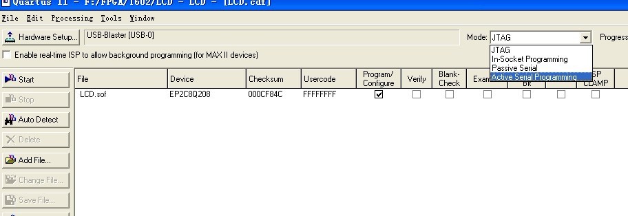(2)在Quartus II的Programmer中,使用JTAG接口通过FPGA中间通道间接对EPCS进行编程。