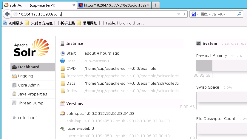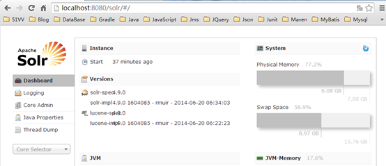 启动Tomcat,打开浏览器输入:http://localhost:8080/solr/admin/,看到启动画面就说明安装成功。