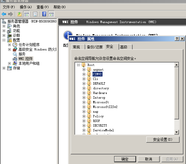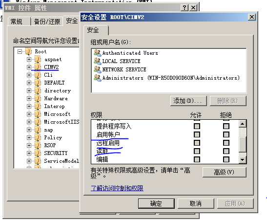 3. 选中CIMV2,添加 域账户 ,并选中 启用账户、远程启用、读取 权限项,这样域账户就可以远程访问WMI了。