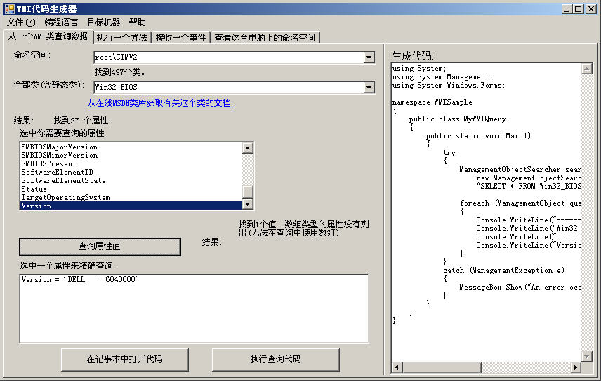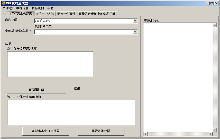 利用WMI代码生成器可以执行查询或者执行一个方法等,还可以查看当前或者远程电脑上的命名空间以及其下的类,并且还可以生成相关的代码(不然就不叫WMI代码生成器了),支持生成的代码类型包括VBS、C#及VB.NET,默认生成的代码是VBS。