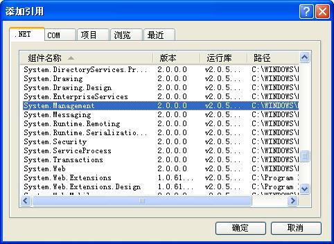 在实际编程中需要注意,System.Management 命名空间中的类都存在于System.Management .dll这个文件中,所以在编程的时候一定要添加对这个dll文件的引用,如下图: