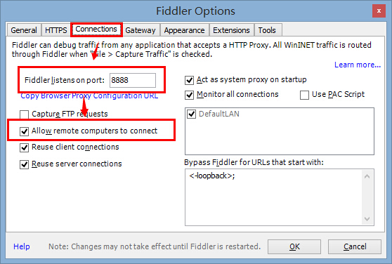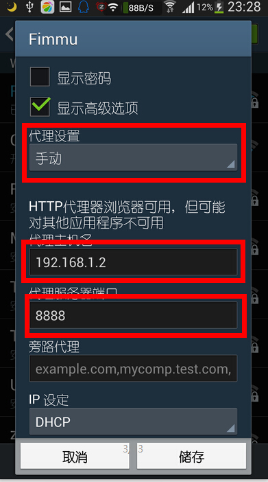代理设置为:手动;代理主机名为你的电脑Ip,端口就是刚才Fiddler设置的端口。