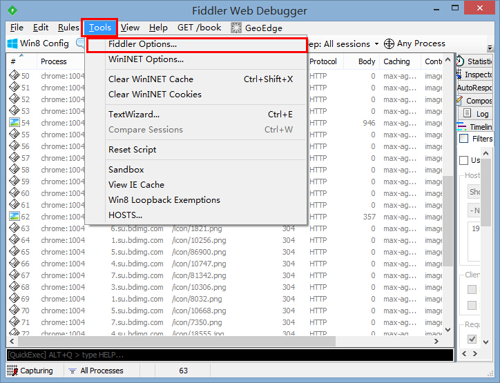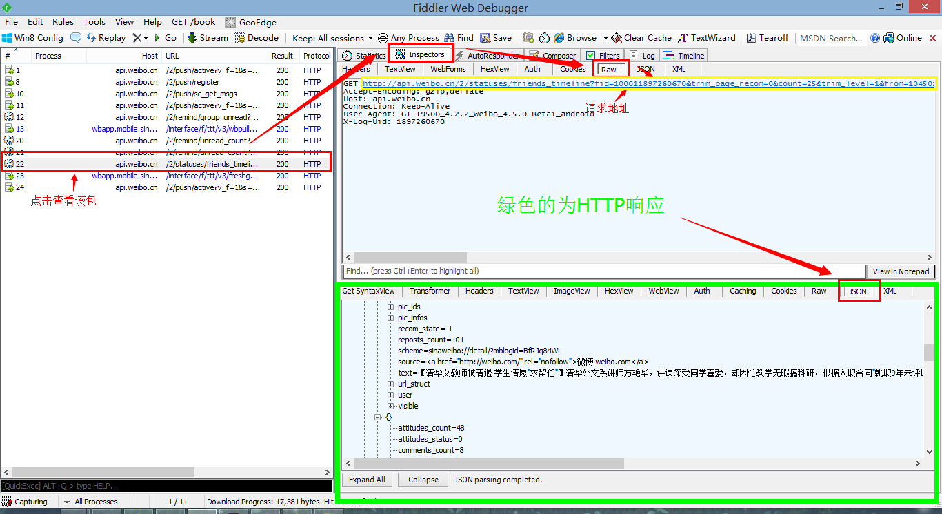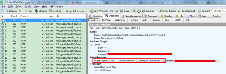 接下去就是Fiddler的基本操作了,我们已经看到手机上的数据包了。