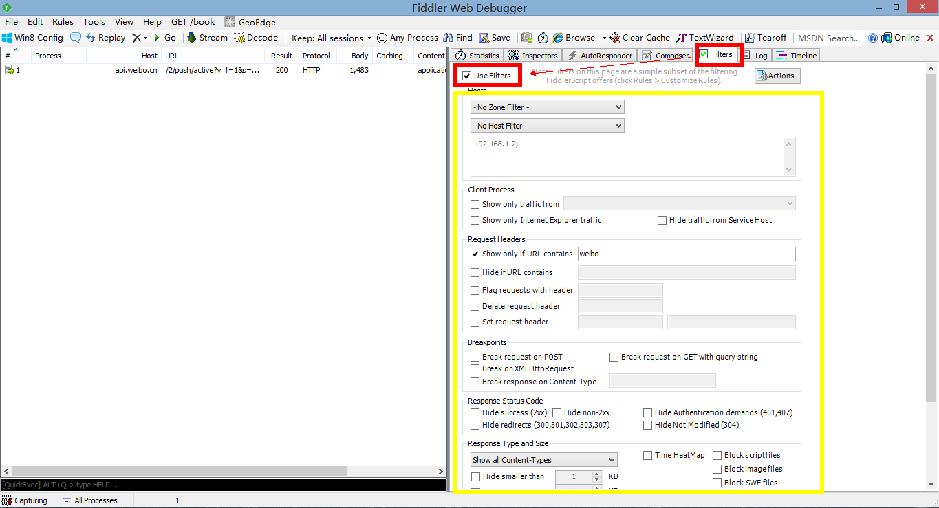 提示:Fiddler可以设置过滤,可以很方便看到我们想要的Http包: