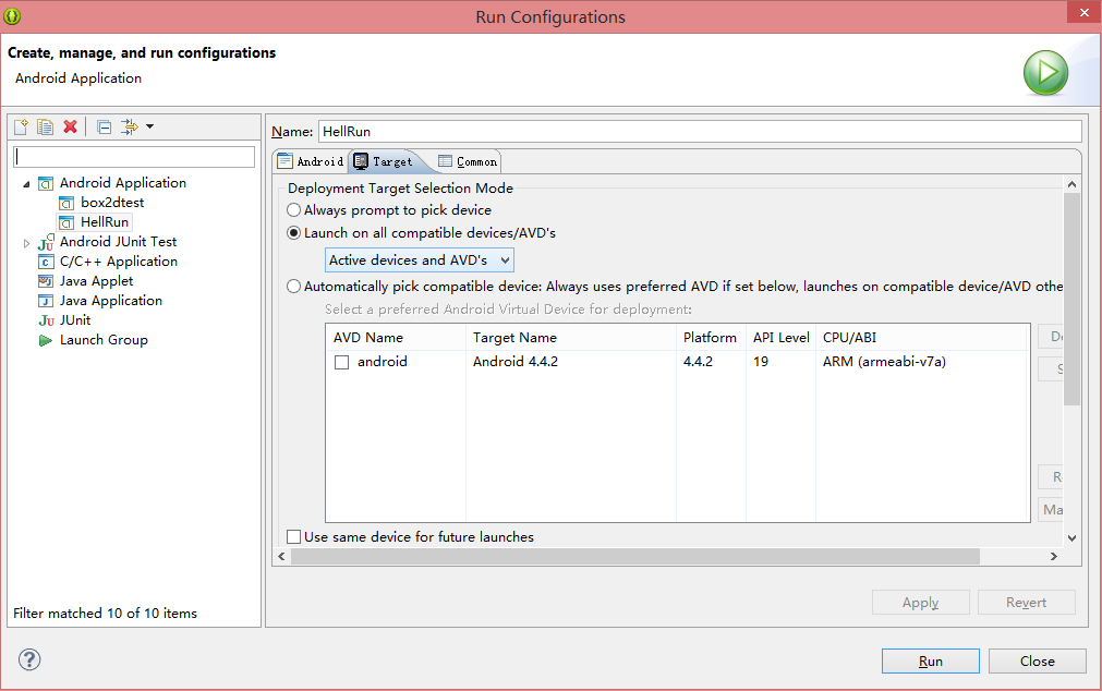 如果是连接真机的话,右键你的项目,选择run as--->run configurations,配置如图所示: