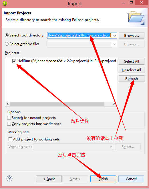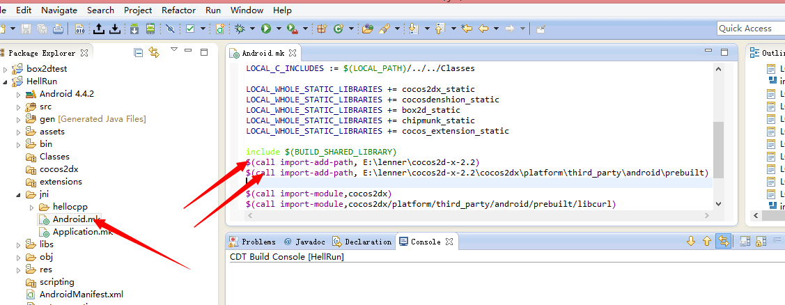 找cocos2d-x所在的路径:E:\lenner\cocos2d-x-2.2\cocos2dx\platform\android\java\src,把这个路径的中的文件复制到你的项目中的SRC文件中:E:\lenner\cocos2d-x-2.2\projects\HellRun\proj.android\src