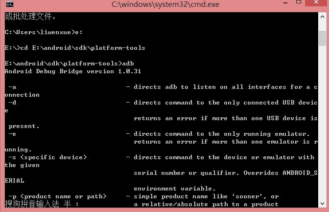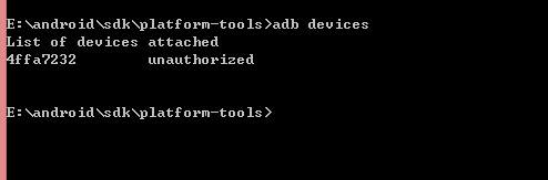 进入你的sdk目录如上图所示,输入adb测试adb是否能用,能用的话,就输入adb devices,如果出现如下图所示就表示连接成功。
