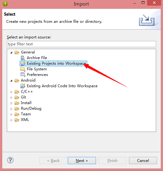 选择Existing Android codeinto workspace,然后点击Next,选择创建的项目所在的文件夹,选择好后点击完成,如图所示:
