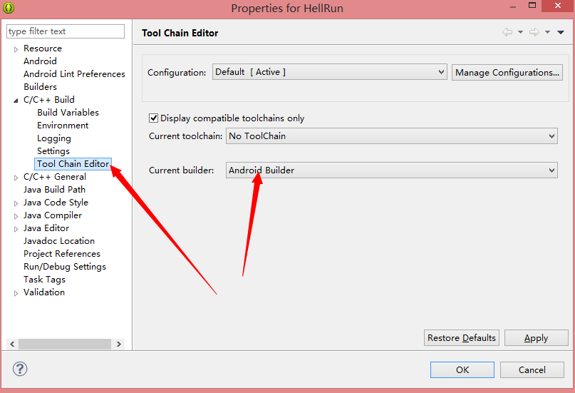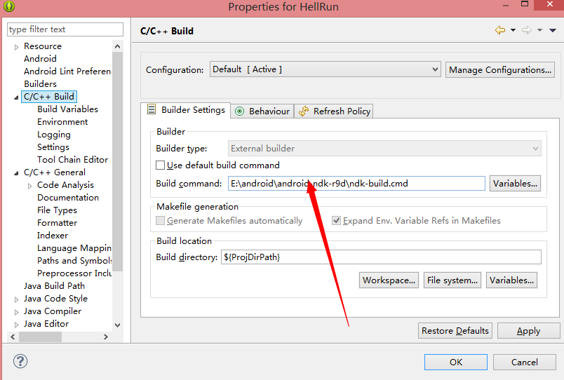 在配置NDK,右键点击项目选择属性,点击C/C++ build 添加NDK路径如图所示: