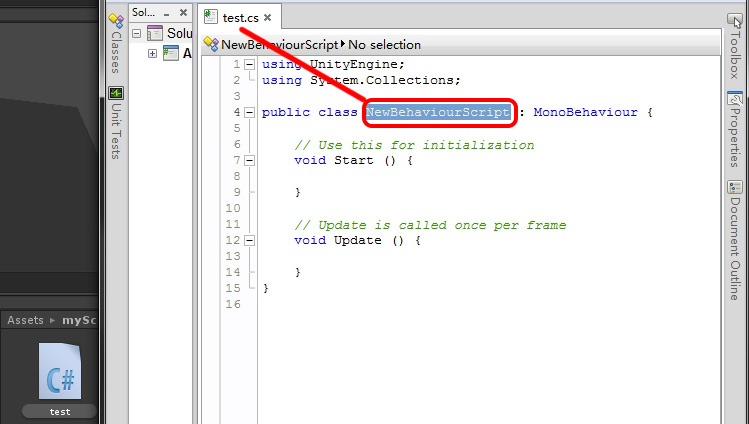4.给脚本命名,然后再双击开启脚本编辑工具(如果脚本名称和内部的类名称不同,一定要更正)。