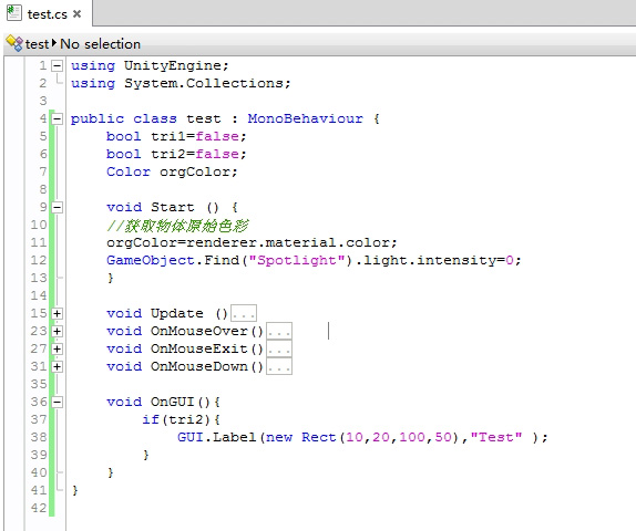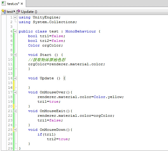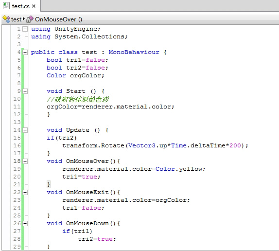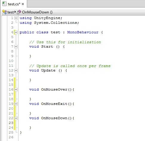 5.加入鼠标相关函数,这里我需要用到OnMouseOver,OnMouseExit,OnMouseDown。此类特殊函数不会有智能拼写出现。