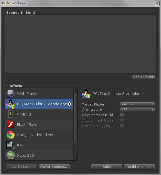 12.发布。执行File->BuildSettings,开启发布界面。设置好要发布游戏的平台以及一些发布的信息,点击Build按钮即可发布一个完整的游戏客户端。U3D支持发布的平台与用户授权和操作系统有关,如IOS游戏需要MAC平台的U3D才能发布,Android需要在系统安装安卓SDK包,次世代主机平台则需要用户向官方购买额外解决方案。