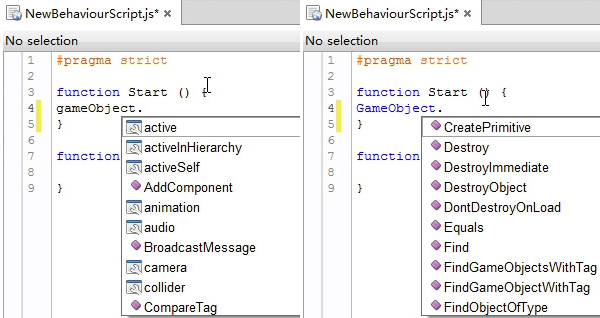 对U3D来说,这是入门级的脚本语言,U3D内置的函数都能通过JS方便的调用。语法上,JS和传统的c语言差不多,需要分号结束符,变量类型定义,大括号……不过它的变量类型定义,是通过冒号接在变量右边,如:Name:string=”Li”。相对其他两种语言,使用JS语法,很多函数不需要实例化就能直接使用,如: