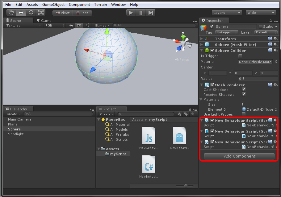 U3D的脚本作用方式很有趣,我称之为“拖放法”。无论是作用在一个具体的场景物体还是管理着批量的物体,脚本首先必须依附于场景中的一个元素才能被执行。要将脚本赋予物体的方式很简单,就是按住鼠标左键将脚本文件拖放到物体的属性面板上(也可以拖放到场景的物体上)。U3D有个概念,那就是component(成分)--类似Maya的节点。包括脚本,所有元素属性都是游戏物体的component。添加、删除、停用、读取、写入component信息,就是脚本所要做的(尽管脚本也是个component)。