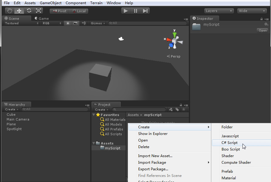 3.双击进入myScript文件夹,创建一个C#脚本。