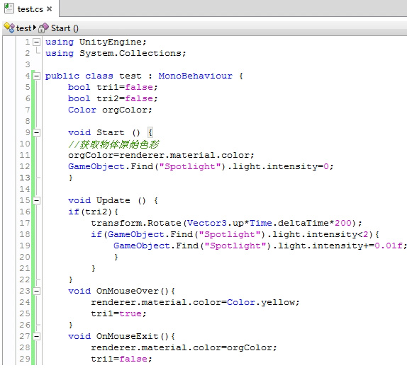 float LightInt =GameObject.Find("Spotlight").light.intensity。如果在Start函数中初始化,Update中就不必每帧执行查找函数,降低游戏效率。不过这里作为一个测试,我也就很省事的忽略了。