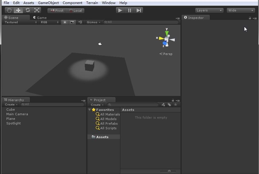 1.点击Hierarchy栏下的Create,创建一个Cube,Plane和Spotlight。