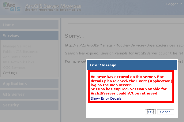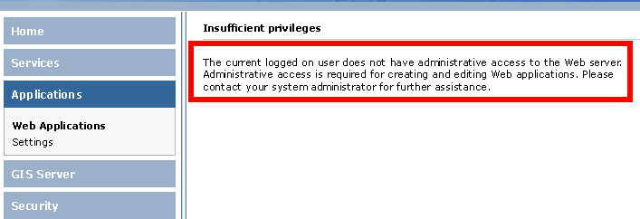 添加自己的管理员账户、arcgissom到agsadmin组中;添加管理员账户、arcgissom、arcgiswebservices到agsusers组中; 再次使用arcgissom登录,发现能够成功了! 3.使用arcgis server manager,创建web application,发现以下问题——“Insufficient privilege,the current logged on user does not have administrative access to the web server.”如下图: